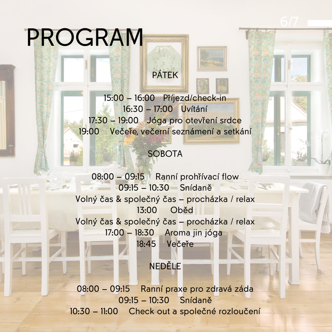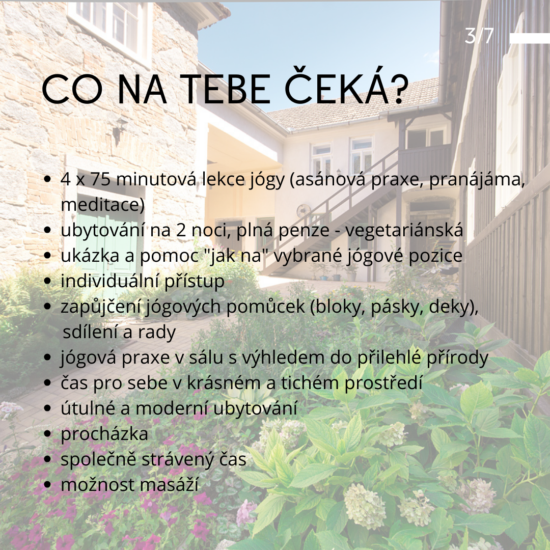 Čekají nás 4x 75 minutové lekce jógy, dýchací techniky, vedené meditace, procházky přírodou a věřím, že i pro tentokrát spousty krásných rozhovorů a smíchu.