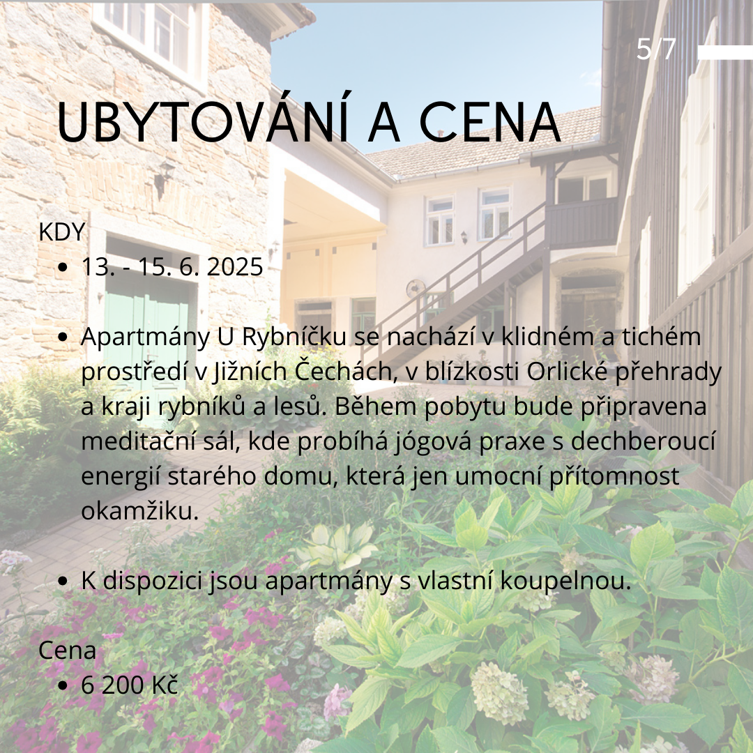 Apartmány U Rybníčku se nachází v klidném a tichém prostředí v Jižních Čechách, v blízkosti Orlické přehrady a kraji rybníků a lesů. Během pobytu bude připravena meditační sál, kde probíhá jógová praxe s dechberoucí energií starého domu, která jen umocní přítomnost okamžiku.